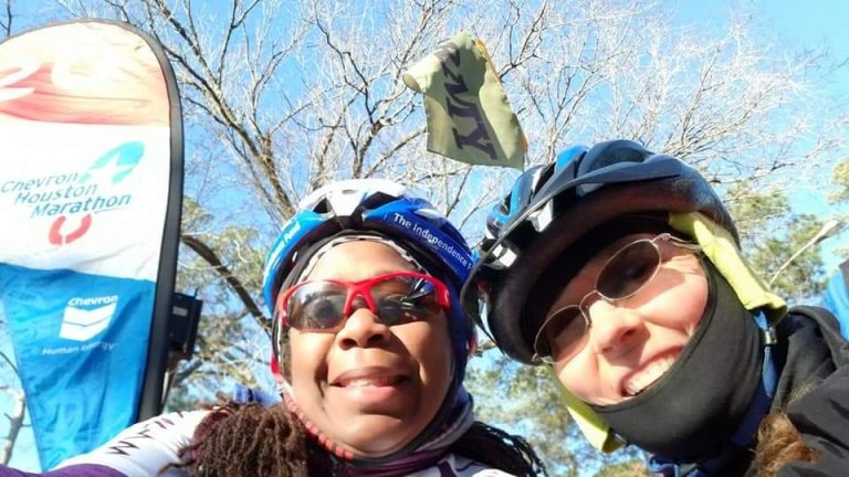 Volunteers moved about frantically ensuring all of our needs were taken care of the entire weekend. My bike guide was a volunteer. I had never met her, but if ever I complete Houston again I will request she be my guide. She kept runners away from me, she told me when to prepare to turn left and right. Sometimes it is challenging to the direction from the ground. She yelled repeatedly and over my music to make sure I got out of the way of the elite runners. She pointed out when we started hearing helicopters to help me to prepare. She pulled over and helped me take off my jacket when I was over heating. She made me laugh every time I ran a red light by asking me if I posed for the camera. She offered to help me go over the huge incline and I humbly declined.