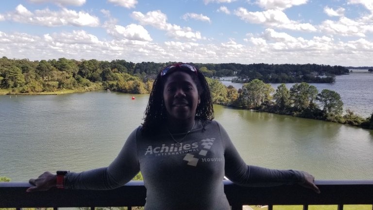 It was a beach start. That sucks for me, no leg brace. I left my leg brace attached to my shoe placed it on the ground and hobbled down the beach to the water. I begin to swim, in the excitement I forget my goggles were on my head. The water temperature is 63 point something degrees, not to bad. I watch as Adessa swims past me; I put on my goggles and begin my swim again. I am the official last person to start swimming. I pass a couple of people vertical in the water. I notice Adessa keeps looking back at me. I’m like just swim, please! You are 10 minutes faster than me stop slowing down! She did that the whole race. I wished I could swim faster, but I couldn’t. I felt cold as I swam, but I thought nothing of it. I made the right turn out of the resort area into the rest of Lake Conroe and felt current, nothing extreme, but current moving against me. My thoughts were interrupted by someone smacking the crap out of my right arm, then smacking the my mid back. I just kept swimming. Praying that wouldn’t wake up the neuropathical pain in that arm. I cursed in my head and called them a SOB. I tried not to focus on that arm. As I’m sighting, I see a guy in a blue cap holding on to buoy. He starts to swim away as I approach. I catch him and pass him. Praying the whole time he didn’t touch me. I make my first left turn. As I sighted, I saw a paddle boarder opposite me along the buoys and two kayaks in front of me. I slow down ’cause they don’t seem to be moving out of my way. I’m thinking did it take me that long? Are they pulling me out of the water? At that moment I turn to breathe and I feel water go into my nose and mouth. Shit! I have dysphagia (swallowing disorder), if I choke now my race is over. I do the most disgusting thing, but I do a modified Mendelsohn Maneuver in the water. I held my breath to stop myself from inhaling and pulling water into my lungs and breath out in the water with my mouth open. Next I turned my head out of the water and inhaled, then turned my head back into the water and exhaled through my nose. As I continued on I passed life guards in the water that looked like frog men. Each time I passed one I thought they were there to pull me out of the water for being to slow. I sure I was the last one on the course.