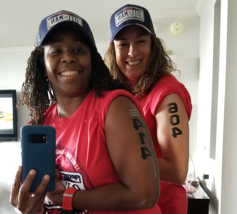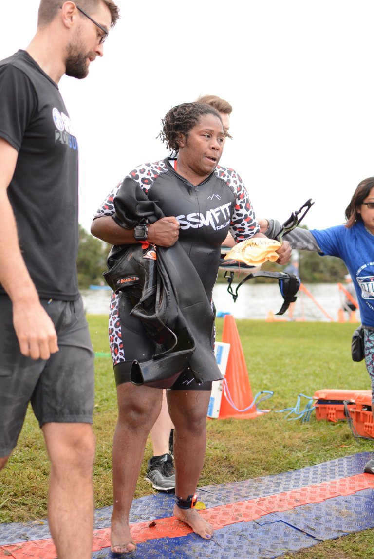 As I stood there, I felt overwhelmed and bombarded, there were so many people standing there. I was rushed and I just went with it. I was frazzled because I hadn’t crossed the timing mat which means my time is ticking. I need to get to the mat. These people are obstacles in my way. I’m not equipped to think right now. “Process Candice”, I screamed inside my head. At that moment, I heard a very calm voice, “Babe focus.” All of the chatter around me was silenced. I refocused and saw Bernie trying to hand me my shoes. I’m upset because my shoes look different, what’s wrong with my shoes? Brace, the brace isn’t attached to my shoe? Is my brace broken? As I freak out I put on my shoes and I see strippers. Not the kind at the club, these are wetsuit strippers. That’s when I realized I still had my wetsuit on.