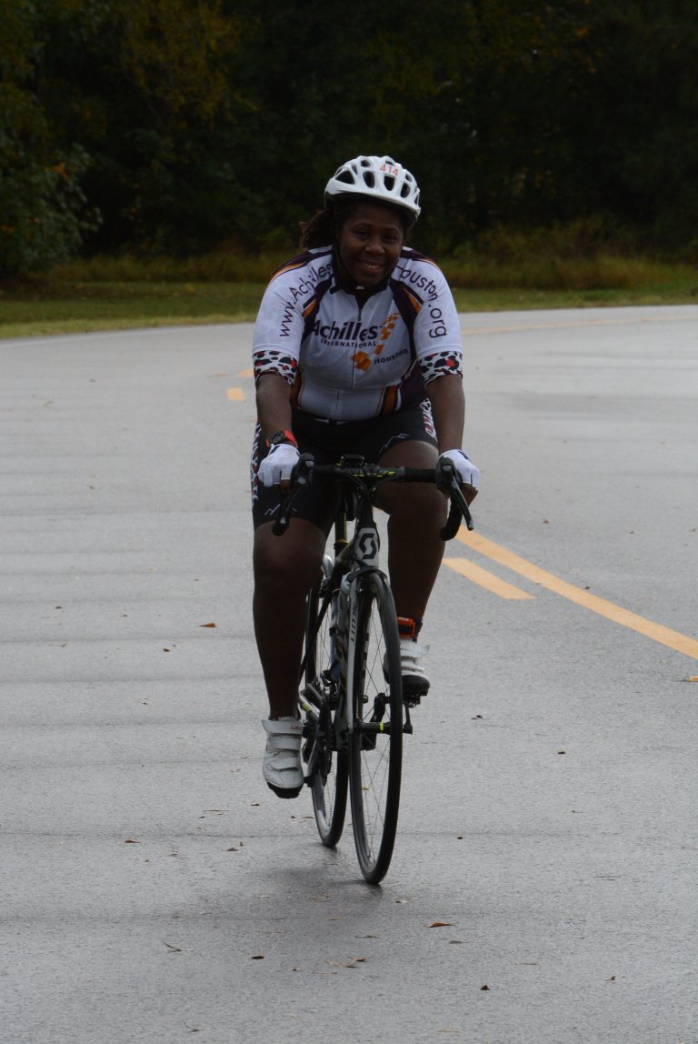 Sometimes volunteers at races tear down water stations early. In my mind I could see the frogmen removing buoys. As I continued to swim I realized I was getting close. I raised my head to sight and saw a life guard. I could hear him say, ” Keep going you are doing great!” I smiled briefly and continued to swim, thinking to myself I know, “I’m doing great! Ya’ll ain’t taking me out of this water alive. I’m getting out of this water under my own power.” As I approached the pier, I was greeted by carpeted stairs and volunteers. I tried to grab the rail with my right hand, but my fingers wouldn’t extend. Why is that still a surprise that I can’t open my fingers? As I tried to use my Vulcan mind trick to get my fingers to open to grip the railing a volunteer grabbed my left arm. I shuffled up the stairs with my limp. My back was locked up so I had to will all of my body parts to move. I was greeted by the happiest person in the world, Bernie. She is the sweetest person alive. She is like Snow White, I swear she can talk to the animals and they can do things for her. She is the Director of the Achilles Houston and just a wonderful person to know. I saw her coming toward me, but I was trying to figure out why. My head was in a fog. I am always in a fog after I get out of the water. But today seemed different. My routine is to get stripped and sit down. She was coming over to me, why is she coming? Is she coming to tell me I did not make the swim?!