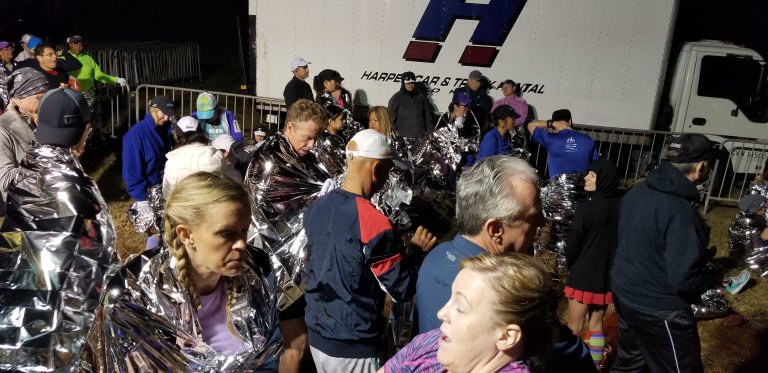 It looked like a Charlie Foxtrot with everyone standing around, but it wasn’t. Bag drop was in a truck that drives your bags to the finish. They collect your blankets before you start to run.
