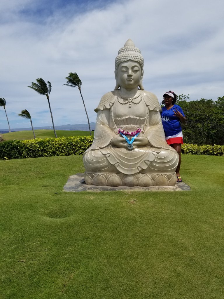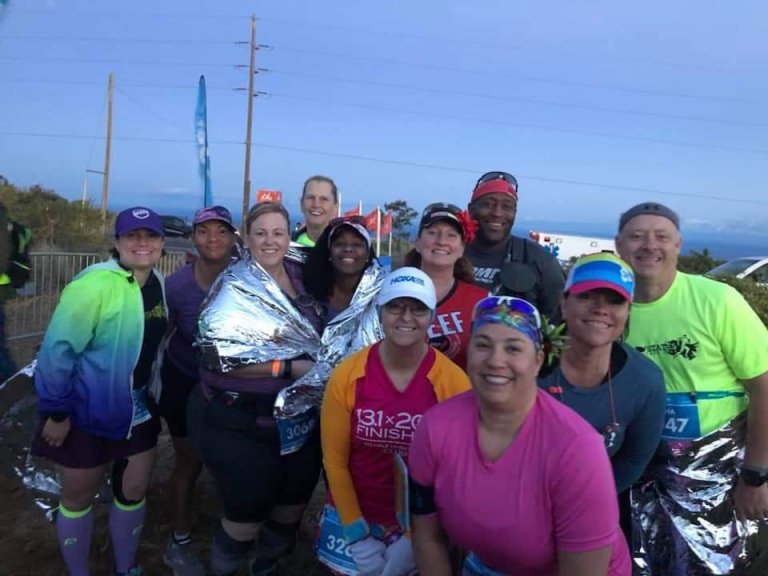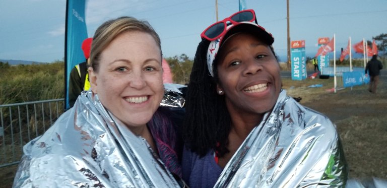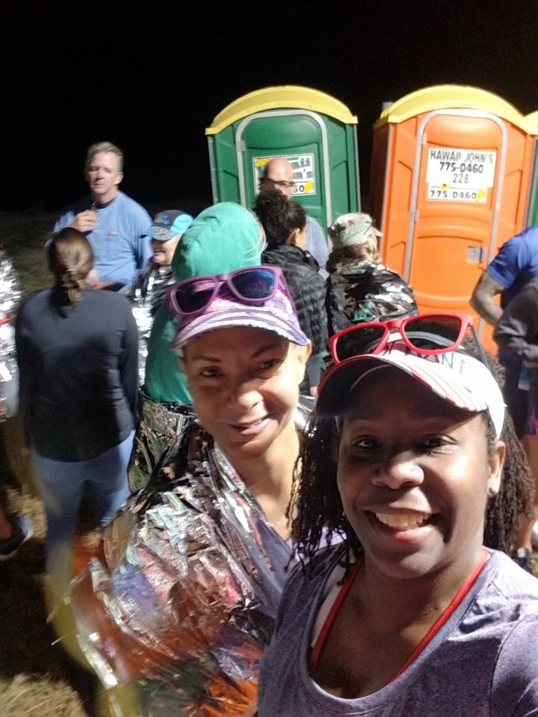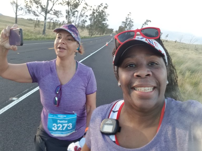 We ran, I let gravity take my body down the slopes. I saw people fighting gravity thinking they are going to hurt tomorrow. I ran until we would level off or go uphill. As I ran downhill I pulled away from Denise, but slowed down once the grade allowed me. The steeper the grade, the faster I flew down the decline. I thanked God for her because in the end I wanted to walk. She kept me motivated to run. We took so many photos. We finished together, the purple sisters they called as we crossed the finish line.