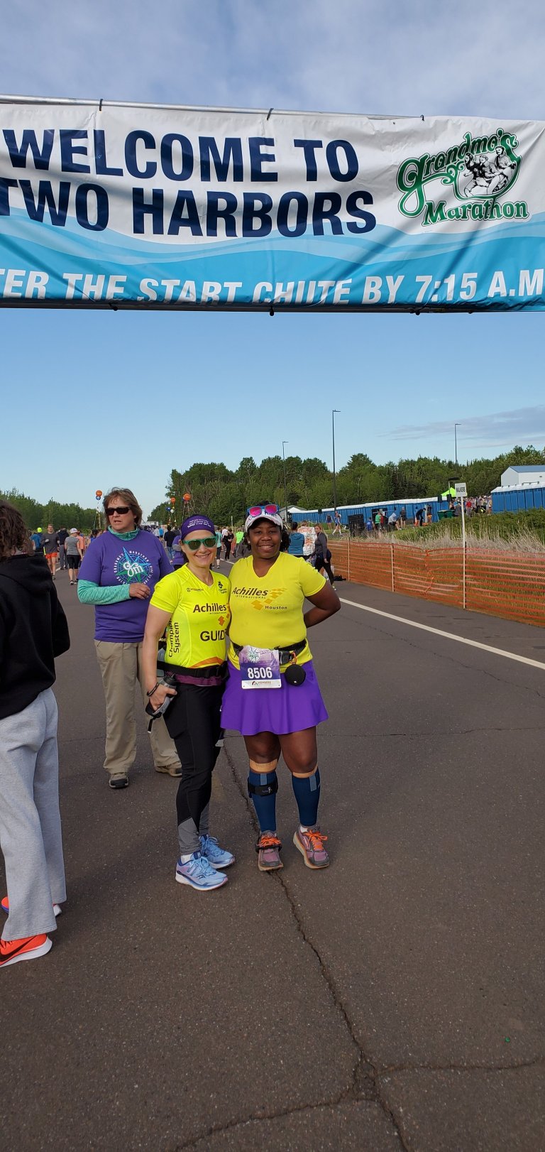 Race day came really quick with a night 5k and dinner. Molly gave me the Kerri Serota, “Happy RaceDay!” Greeting. I woke up at 5 to eat breakfast and get ready and to catch the shuttle between 5:45 and 6:15. Minnesota has these cool skywalks that connects to basically anywhere you need to go, today it was the DECC. There is a 40 minute ride to the start. As I boarded the bus I had a leg brace malfunction and grabbed a seat with a bearded guy. There I sat down and shared with him my story, I have no idea how we got talking, but we did. We exited the bus and parted ways. I stopped took a few pictures and met my guide Terri at the start.