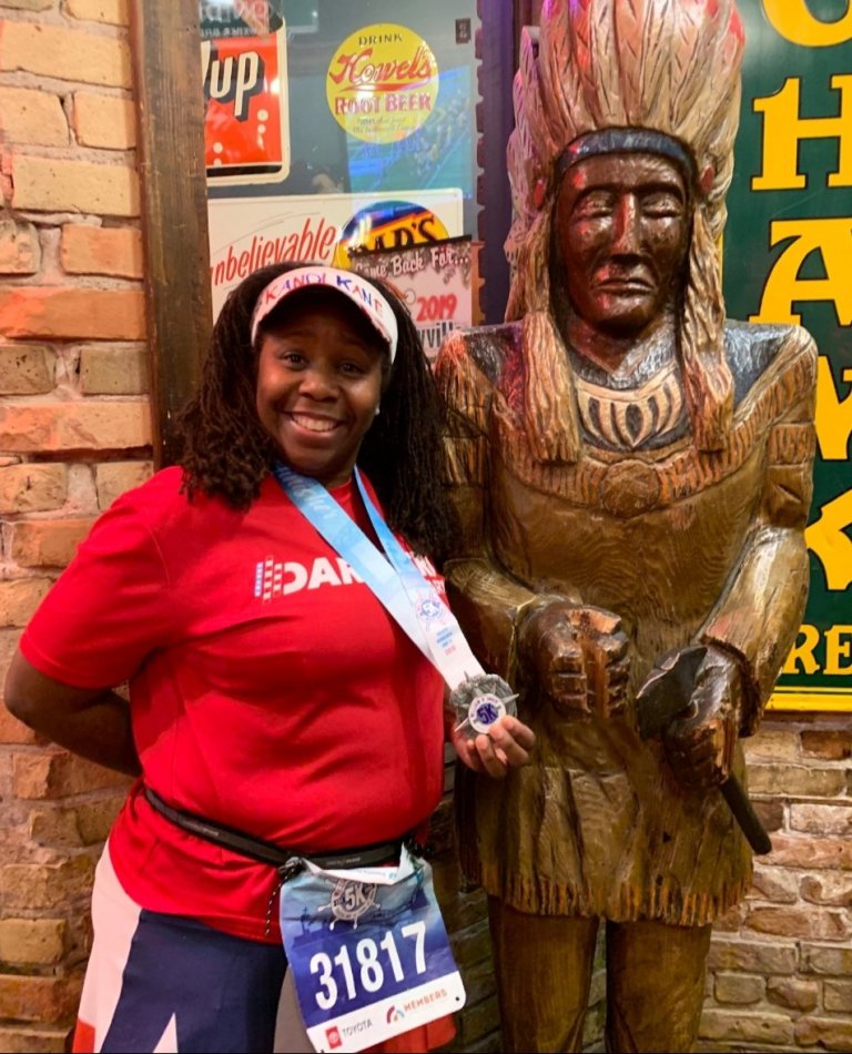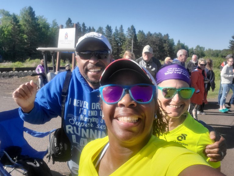 We start the race and I am not in the best shape. My lower back hurts, my legs were burning, but I planned to claim this state and find that person that God had for me to hear my story on the course. We ran and walked and we moved down the course as a unit. She was my support person and she gave me the best support. Her husband at mile 3 had strangers cheering for us. Of course I had to stop and take a selfie with her hunny bunny.