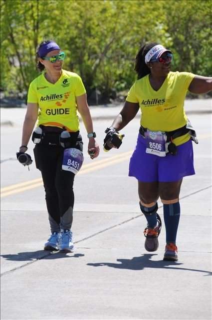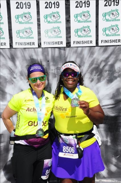I like to make people aware that I have a disability so they don’t run between me and my guide. Of course they do it anyway sometimes they push through and almost knock me down. This day having the sign seemed to motivate others to cheer her on. We completed the 5k and headed to Grandma’s Restaurant for dinner.