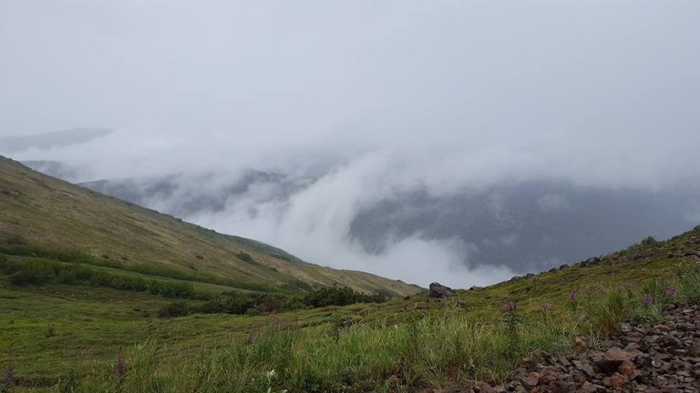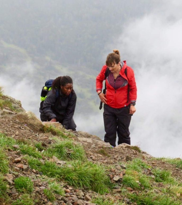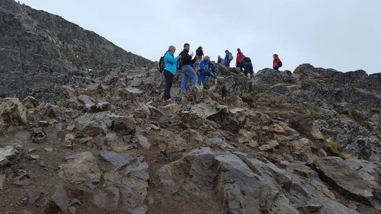 As the trail went from dirt to slippery rocks to grass and back again I was paralyzed by fear. My heart rate increased, my breathing changed. I looked up at the person in front of me and said to myself, ” If he can do it so can do it too”. I was terrified when I saw a guy almost slide off the cliff behind me. At that moment I realized there were no safety nets. I did not realize there would be nothing to break our fall. I did not realize that I would be able to look down and see trees and rocks miles down, I definitely did not want that to break my fall. Where are our picks and rope like in the movies?