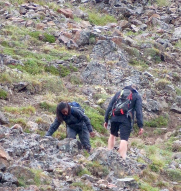 I became more frightened as I grabbed for a rock and it shifted. It was frightening not having a secure place to plant your feet. I was the last one up to the summit and the last one down. My mobility impairment played a small part in that. My fear of dying on the first day of my trip played the rest.