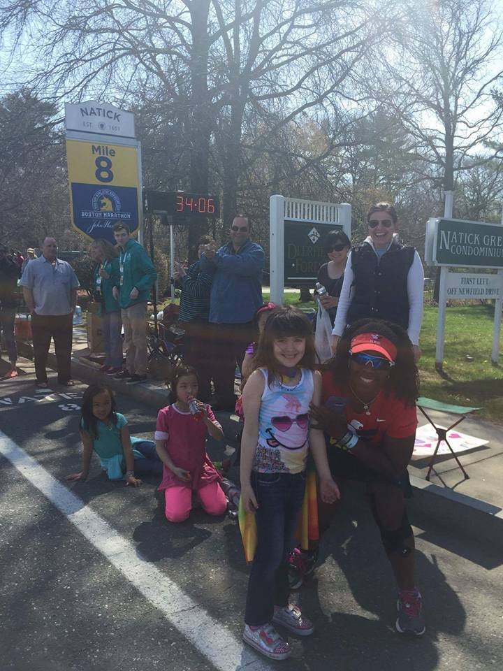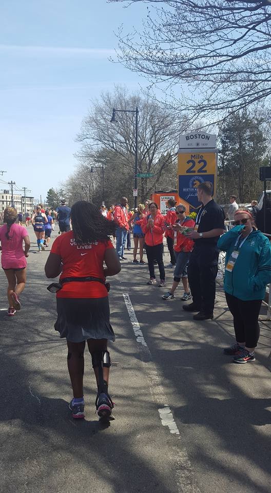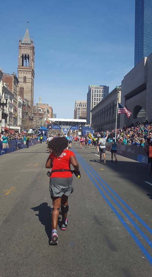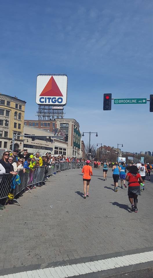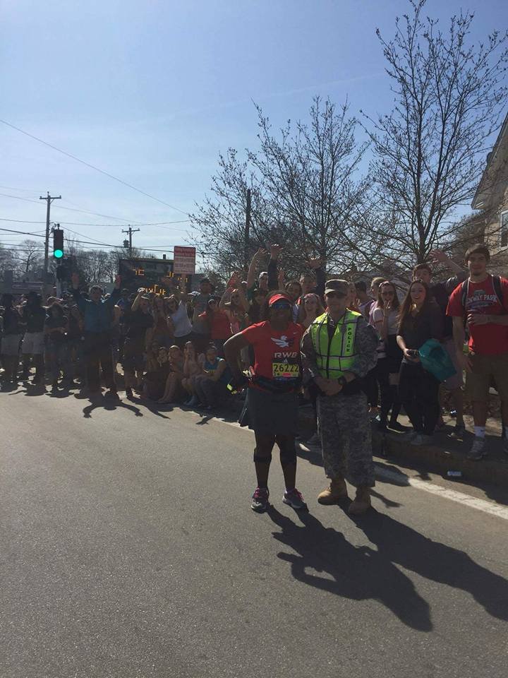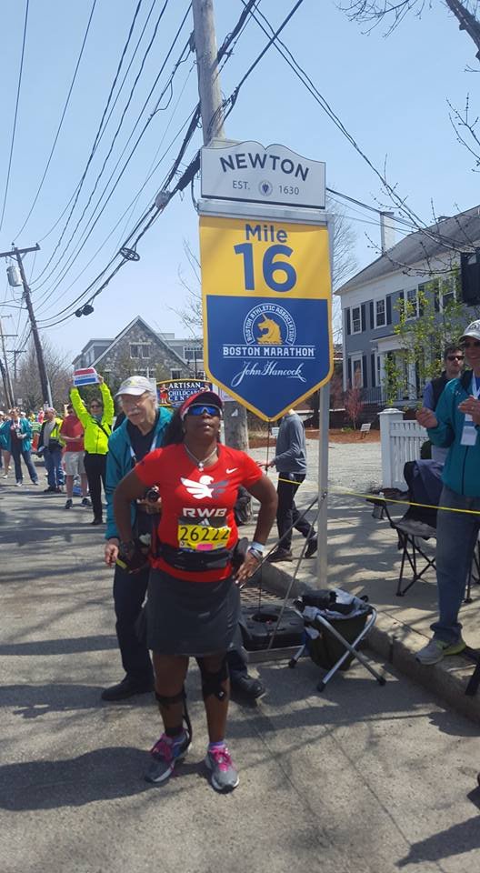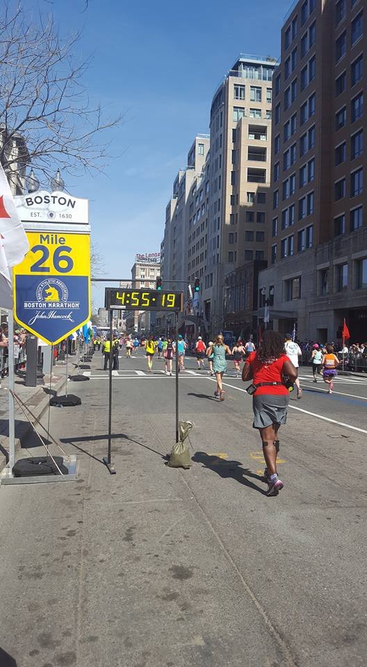I sipping gatorade at every station. I have done things I never do at races, eat people’s food. I do not know you sir do not offer me food. Ha, today it was thank you, gobble the food up, thank you. After leaving the Army I became a germaphobe. I’m almost OCD about the exchange of germs and cleanliness. So when I tell you I grabbed cut oranges from strangers it was because I refused to hit a wall. I knew I needed to keep fueling, I didn’t train on rolling hills I’m front flat ole Houston. I did part of the bridge series and ran in different states for different terrain on my long runs with a variety of weather. I ran parking garages and the Sienna plantation bridge. Thoughts flood my mind. “Yeah, my body is broken, but I am well trained. That right big toenail is detaching I can feel it. Oh man I can never wear sandals again! My freaking foot hurts. What another mile mark ok Jada take this picture I can’t keep breaking my momentum I want to walk. That’s it I want to walk. What the…where is this negative self talk today? What overridden by pain? That’s new, this Boston Baby and I can’t stop cause these runners are going kill me.” I am taking in the sounds o the crowds they are still cheering, what the heck? I look down and see a cute like black girl about 3 or 4 years old standing in the open with her hand out noone is slapping her hand. I maneuver through the crowd I yell out I’m coming! She smiles her face lights up and I slap her hand. I’m feeling great and wouldn’t you know it. Boom-pow, I trip what the hell, really? I feel a twinge in my back. I can’t stop running she just gave me a power up. I look up and see a hill, walk time. My hamstrings are tight, my quads are tight but only my left leg that is the good side. I’m compensating too much. I need to give this right leg more work or I’m not going to make it. These hills in Newton are not playing…I’m boycotting Fig Newtons cause it must have come from Newton and I hate hills. I wonder if these folks know their town sucks. They are cheering like crazy though, just smile and bare it. I’m reading signs my butt is tight. I’m thinking I’m going to be sexy after running Boston next year cause my training starts when I get home. The whole time Jada is more than 20 inches in front of me. She is constantly looking back and I’m getting it finally doing the best I can do in a marathon. I am giving more to this course than ever because there is something for me to ingest at every single mile. I am taking in everything. So the hill before Heartbreak. My goal was to run Heartbreak. So I’m running this mountain of a hill and fly down the other side. Ok my, my right foot gives out at the base of the hill seriously?