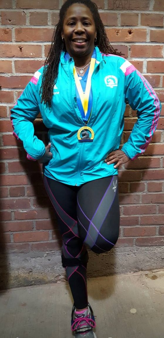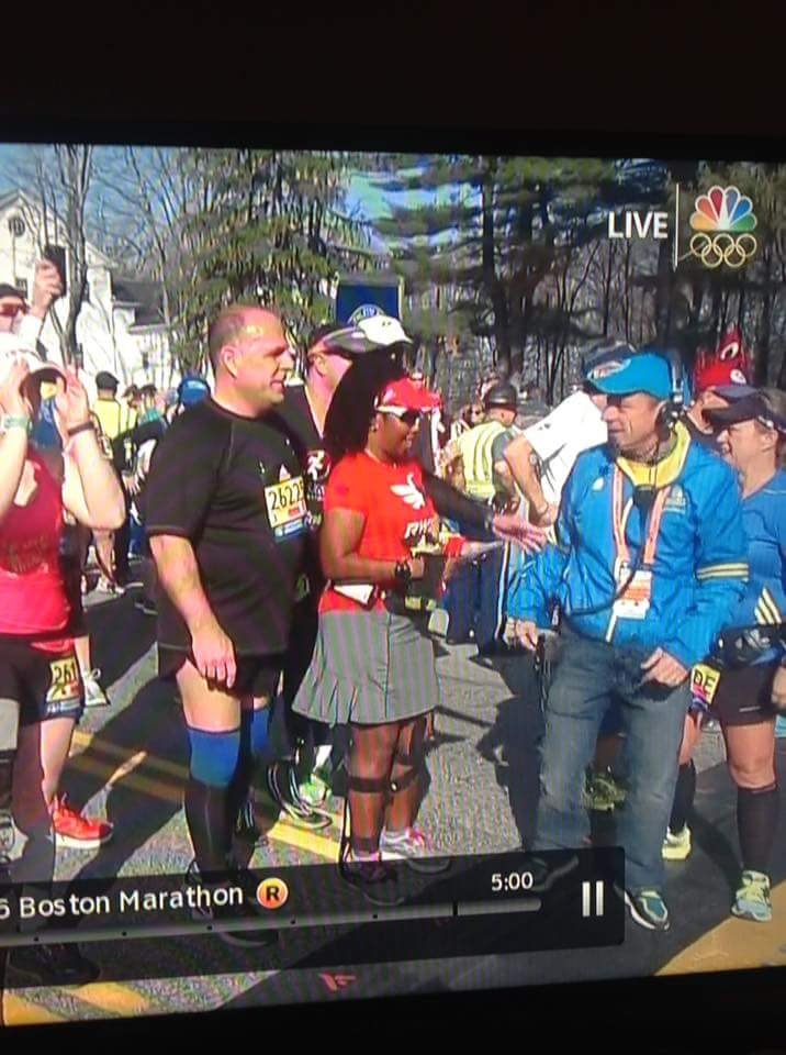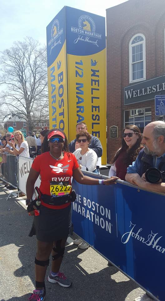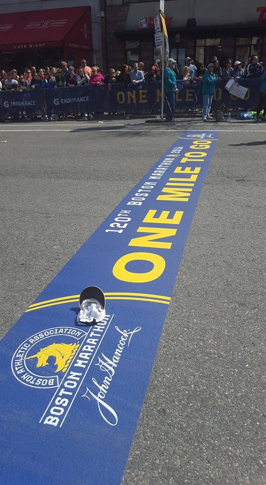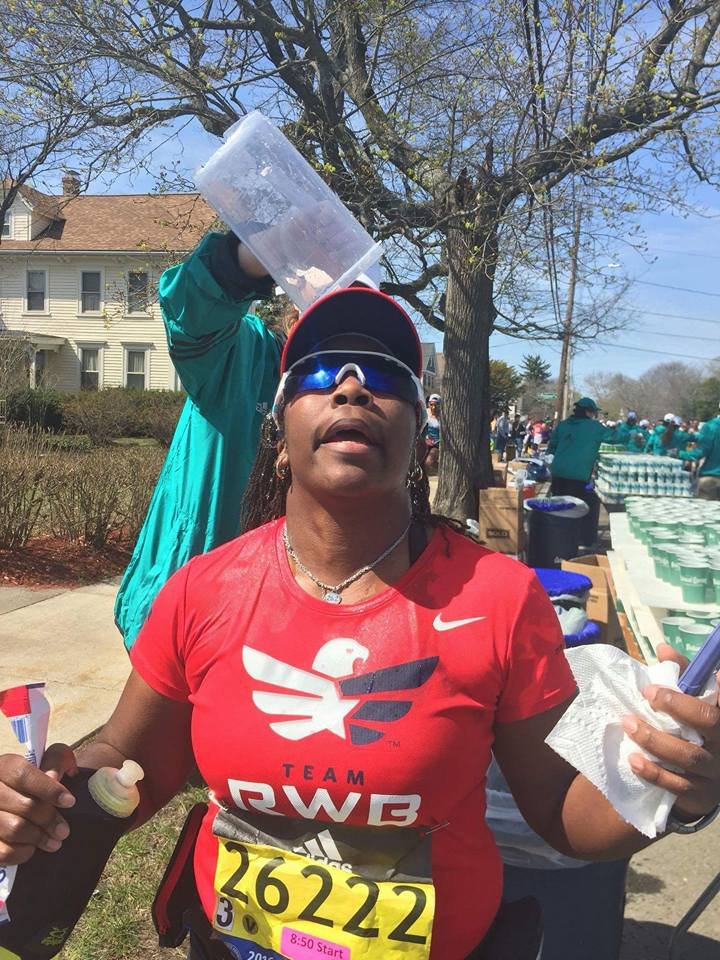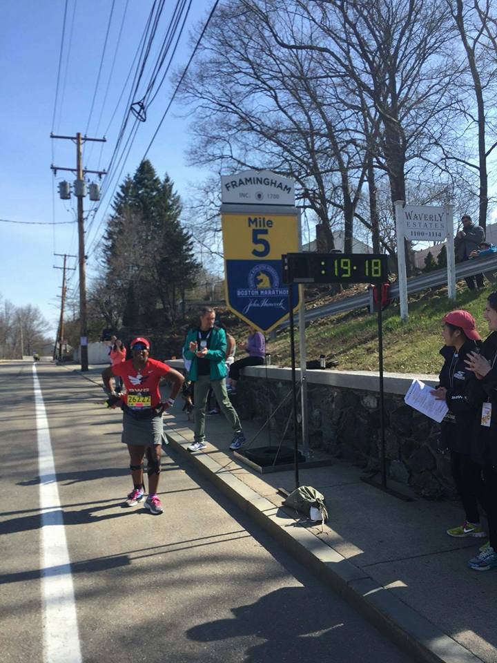 I sipping gatorade at every station. I have done things I never do at races, eat people’s food. I do not know you sir do not offer me food. Ha, today it was thank you, gobble the food up, thank you. After leaving the Army I became a germaphobe. I’m almost OCD about the exchange of germs and cleanliness. So when I tell you I grabbed cut oranges from strangers it was because I refused to hit a wall. I knew I needed to keep fueling, I didn’t train on rolling hills I’m front flat ole Houston. I did part of the bridge series and ran in different states for different terrain on my long runs with a variety of weather. I ran parking garages and the Sienna plantation bridge. Thoughts flood my mind. “Yeah, my body is broken, but I am well trained. That right big toenail is detaching I can feel it. Oh man I can never wear sandals again! My freaking foot hurts. What another mile mark ok Jada take this picture I can’t keep breaking my momentum I want to walk. That’s it I want to walk. What the…where is this negative self talk today? What overridden by pain? That’s new, this Boston Baby and I can’t stop cause these runners are going kill me.” I am taking in the sounds o the crowds they are still cheering, what the heck? I look down and see a cute like black girl about 3 or 4 years old standing in the open with her hand out noone is slapping her hand. I maneuver through the crowd I yell out I’m coming! She smiles her face lights up and I slap her hand. I’m feeling great and wouldn’t you know it. Boom-pow, I trip what the hell, really? I feel a twinge in my back. I can’t stop running she just gave me a power up. I look up and see a hill, walk time. My hamstrings are tight, my quads are tight but only my left leg that is the good side. I’m compensating too much. I need to give this right leg more work or I’m not going to make it. These hills in Newton are not playing…I’m boycotting Fig Newtons cause it must have come from Newton and I hate hills. I wonder if these folks know their town sucks. They are cheering like crazy though, just smile and bare it. I’m reading signs my butt is tight. I’m thinking I’m going to be sexy after running Boston next year cause my training starts when I get home. The whole time Jada is more than 20 inches in front of me. She is constantly looking back and I’m getting it finally doing the best I can do in a marathon. I am giving more to this course than ever because there is something for me to ingest at every single mile. I am taking in everything. So the hill before Heartbreak. My goal was to run Heartbreak. So I’m running this mountain of a hill and fly down the other side. Ok my, my right foot gives out at the base of the hill seriously?