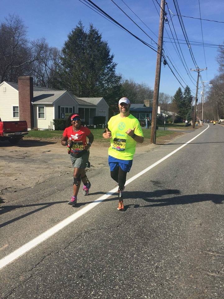 I told Jada, we are going to have to take a picture of just the mile marker. She begins to take pictures as I run by. Ingenious! More crazy thoughts, how did I end up here in Boston at this marathon? Oh that’s right I met Dave, the race director, on an elevator at Schlitterban South Padre in September.