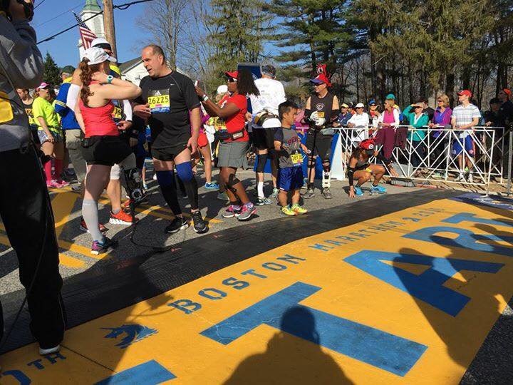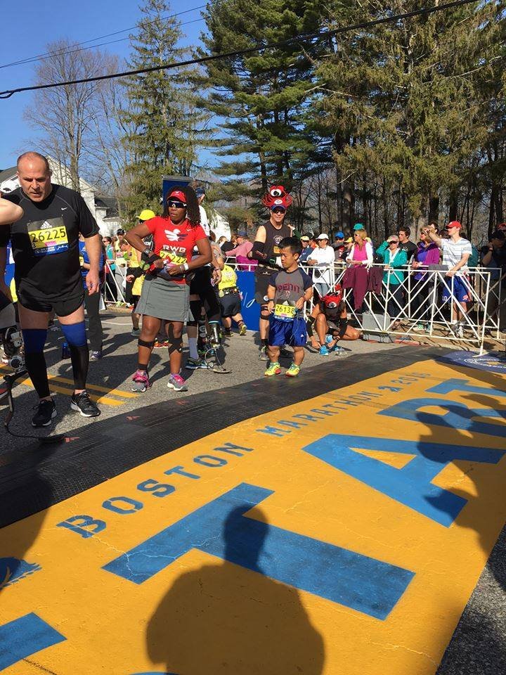I paid for the VIP Package with Marathon Tours and stayed at the Marriott Copley. Marathon Tours had shuttle busses with a bathroom in them, but they didn’t transfer the mobility impaired athletes down to the start. Instead I had to walk .6 miles to the Sheraton to catch the Athletes with Disabilities Bus. I thought I would ride the school busses like everyone else. It wasn’t too bad because Jada met me at the Westin and we walked together and met some of her friends then loaded the bus. The bus was a charted bus with a bathroom. After we boarded the bus I ate my Subway sandwich. I wasn’t feeling to well, but it didn’t matter I was going to have to run this marathon. There were people that were so excited that I was running it. I was like, ugh it is just another marathon. I tried to get pumped up, but was hurting. I just need to get this run done. I had to finish it because people are really stoked for me. It was took approximately 45 minute to make it to the start line.