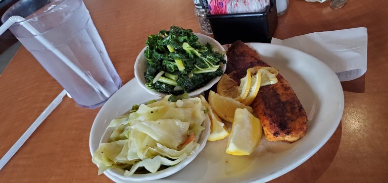 Now the dilemma, which was the least greatest of the necessary evil? I chose to eat a t Luby’s which is a cafeteria type restaurant. There are choices between different meats, starches, veggies and of course desserts. I chose Blackened tilapia, there was no grilled fish, I have chicken at home I am not paying for more chicken. The baked fish they had had mayo on top with some other junk. I looked at my option and opted for kale and cabbage. I really wasn’t concerned with the sodium, but I was concerned about the dessert and the roll you get with the meal.